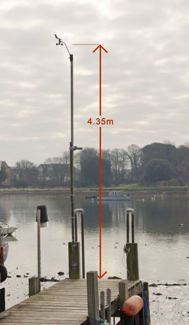 Anemometer Exposure: The anemometer is on a pole 4.35m above the jetty decking which itself is about 4.8m above chart datum. This implies an anemometer height which varies between about 7.2m above the mud at low tide and about 4.4m above water at the highest spring tides (the maximum tidal range is about 5m). The fetch (see panorama below) varies from about 0.6km to the SSW to 0.24km to the south, but is restricted to the north by houses, the closest being about 30m away. The roof of the blue windowed shed at the shore end of the jetty is about 2m below the anemometer height. The fetch to the east is about 0.4km but there are many obstructions.
